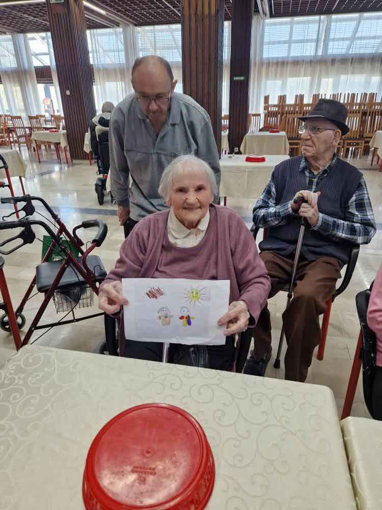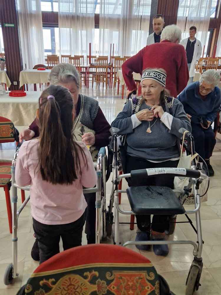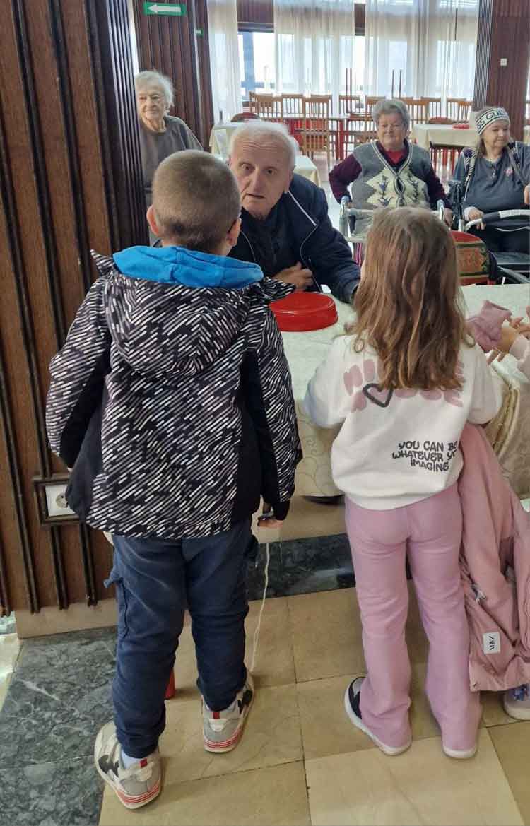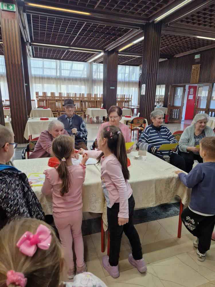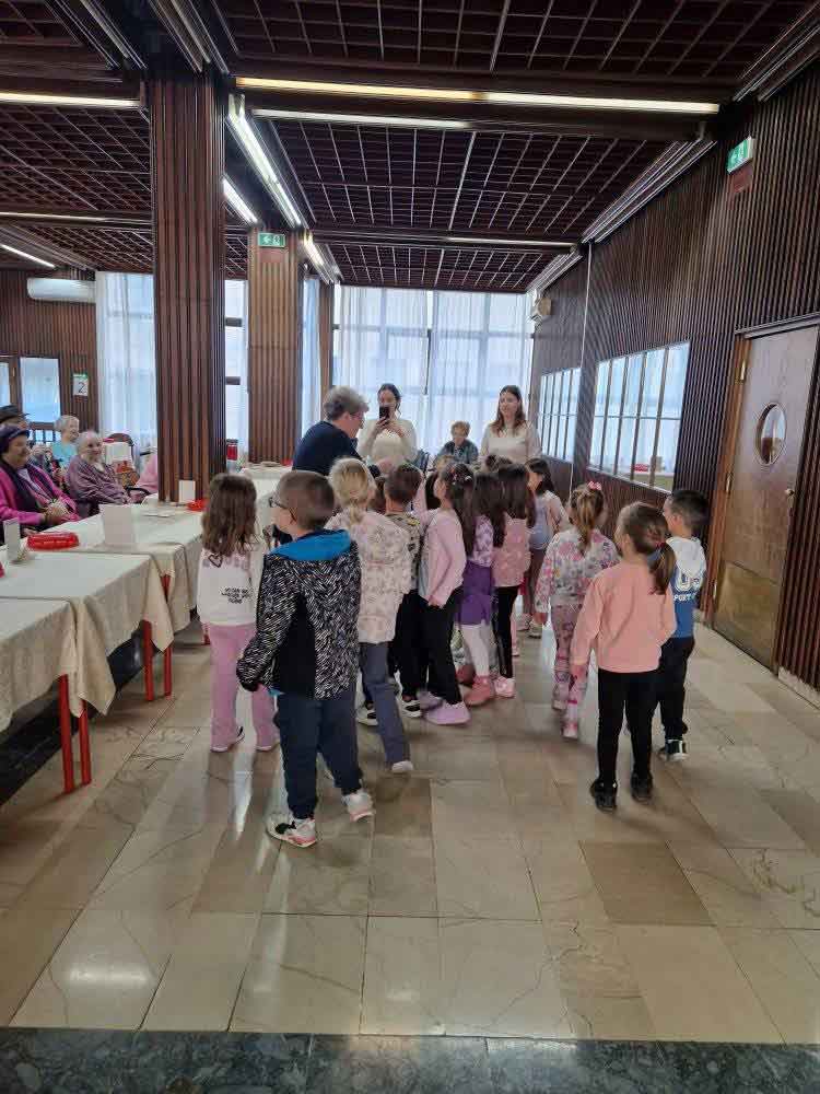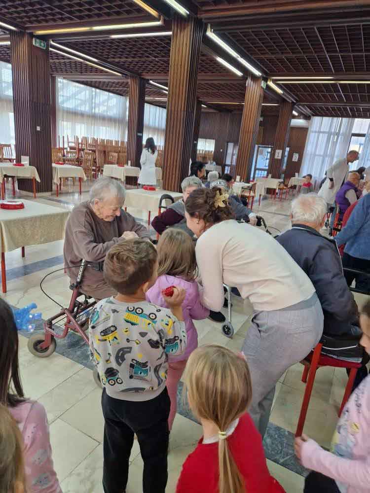 Деца су, уз помоћ својих васпитачица, припремила песмице и поклоне за баке и деке у дому. Корисници су им узвратили загрљајима и цветићима, које су правили у радној терапији дома.